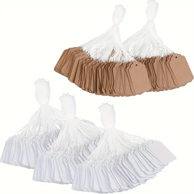 Zawieszki kartonowe ze sznurkiem – białe i naturalne. Puste metki o wymiarach 3 × 4,5 cm, gotowe do oznaczania cen, produktów lub dekorowania prezentów. Wykonane z solidnego kartonu, z przewleczonym sznurkiem – wygodne i praktyczne w użyciu.